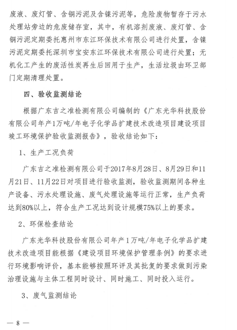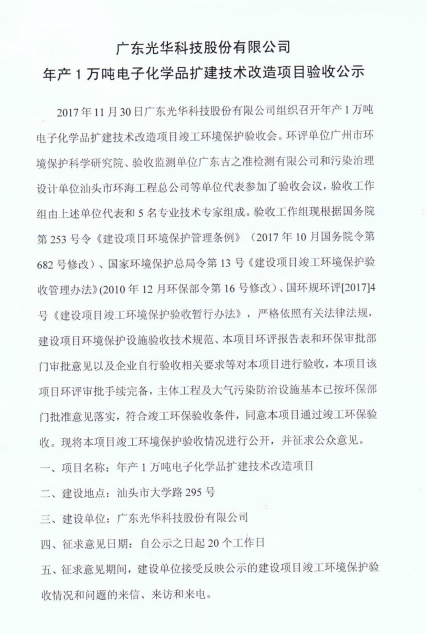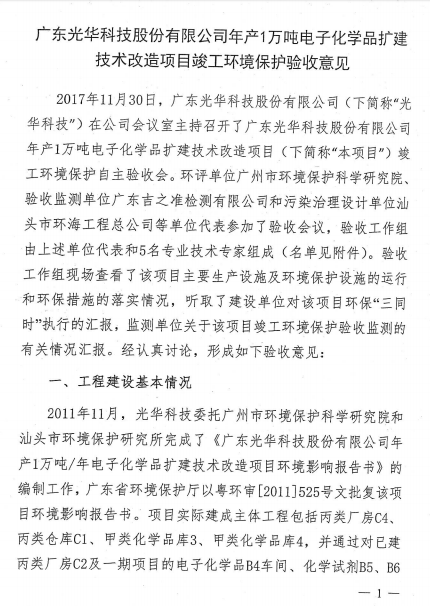 光華科技年產(chǎn)1萬噸電子化學(xué)品擴(kuò)建技術(shù)改造項(xiàng)目于2017年11月30日組織了項(xiàng)目竣工環(huán)保自主驗(yàn)收,經(jīng)過專家組及參會(huì)人員的共同評(píng)審,同意本項(xiàng)目通過竣工環(huán)保驗(yàn)收,現(xiàn)予以公開。
