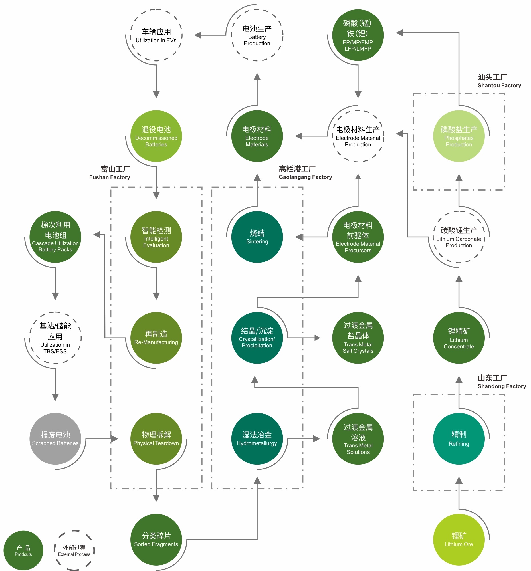 光華科技作為全國范圍內符合《新能源汽車廢舊動力蓄電池綜合利用行業規范條件》的五家單位之一,國家溯源平臺再生利用和梯級利用企業,廣東省動力蓄電池回收利用試點單位,掌握“動力電池梯級利用-拆解分類利用-材料修復-有價金屬回收-材料制造”全生命周期價值鏈技術和工程化能力,為業界提供具有國際先進水平的退役動力電池全生命周期整體服務方案。